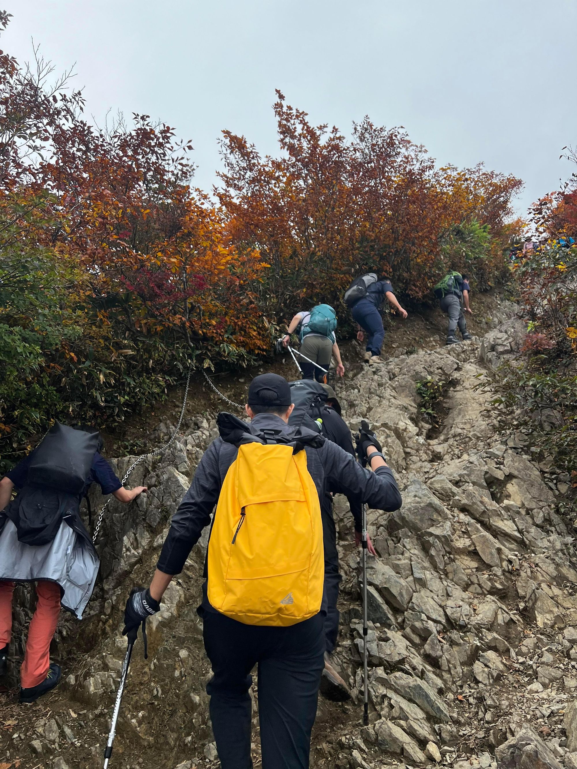 そうこうしているうちに山についたのだけど、紅葉が綺麗だな〜とおもいながらロープウェイで登った先から本格的な登山がスタートした。”小学生でも登れる山”って聞いてたので、まあピクニックぐらいかなと舐めていたらまあ写真のように険しい岩があり、、それって小学生でも起業できるやんっていうのと同じ表現だったんだなと気づいた。